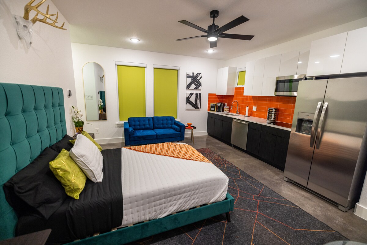 Kick back and relax in this brand new calm, stylish studio. Located off of Interstate 35, this is a prime location for taking a quick trip down to Dallas or to the UNT college campus. Our guests will enjoy a private unit with a walk in shower, full size appliances, in-unit washer and dryer, and complete blackout shades for those that work nights or like to sleep during the day. This space would be ideal for parents visiting their children at UNT or traveling healthcare professionals.