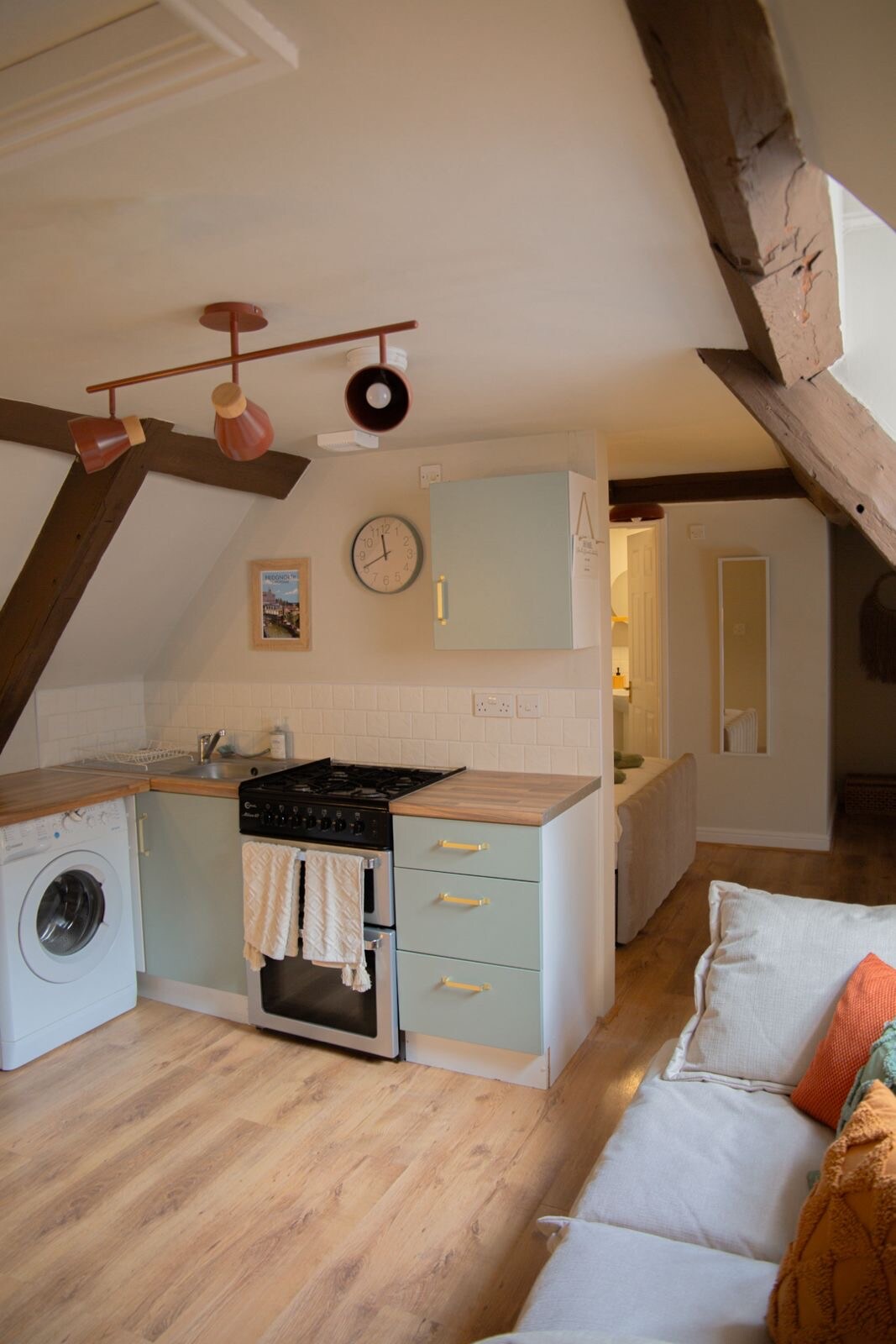This lovely open plan loft apartment is in Woodthorpe, a charming hamlet on the outskirts of Loughborough. A five minute drive to Loughborough or the University. The loft has views over Beacon Hill and can walk directly out into the countryside. It is situated on a country lane which not a through road so very quiet. The property has a small kitchenette with a microwave, two ring induction hob, frying pan and saucepan. A fridge, sink, kettle and plates, bowls and cutlery.