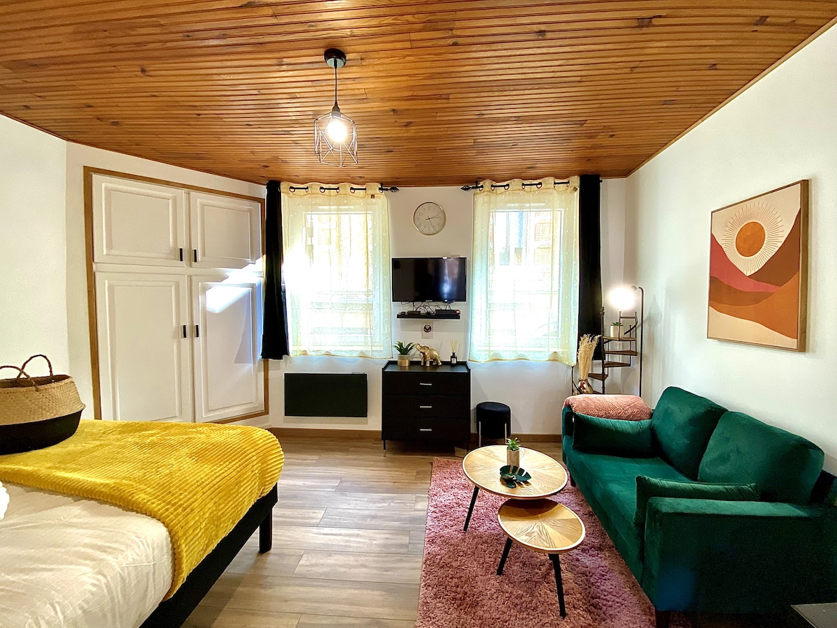 New studio-type apartment, with mobile air conditioning, dishwasher, induction cooktop, microwave, TV, possibility to have breakfast or snack at the La Rotonde bakery 150 meters away. Numerous public parking lots nearby, Intermarché, Aldi, gas station, city center 700 meters away, train station 15 minutes away. Bed linens and towels provided, coffee and tea available. Possibility to book last minute, 100% self check-in, you arrive at the time you want.