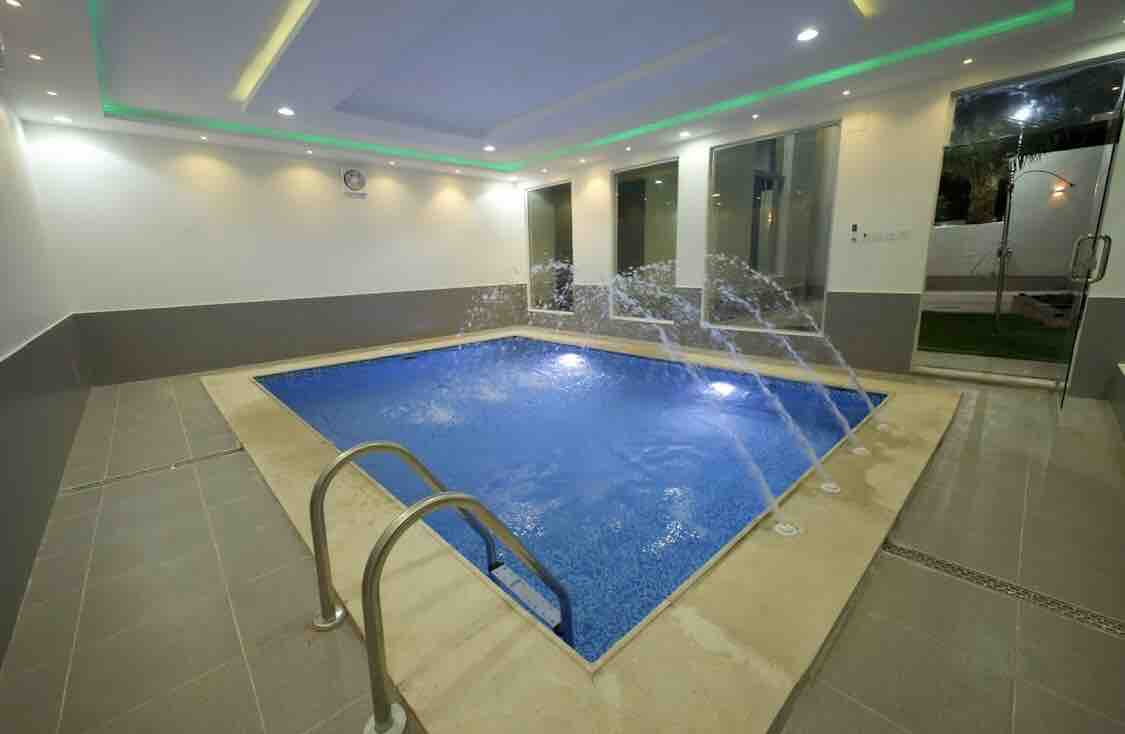 Welcome to *Sunset Resort* Our Location: Al Amariyah/Riyadh Resort Facilities: - The resort is 3000 meters -2 bedrooms, one master bedroom - A large main hall with an elegant design that can accommodate 38 guests. - Dining table with 12 chairs. - 85-inch TV. - A high outdoor sitting area overlooking the building that can accommodate 12. - Secondary seating for 6 people with TV - A fully equipped kitchen. - 4*8 graduated pool (there is a barrier) Large green areas - Spacious private parking inside the resort.
