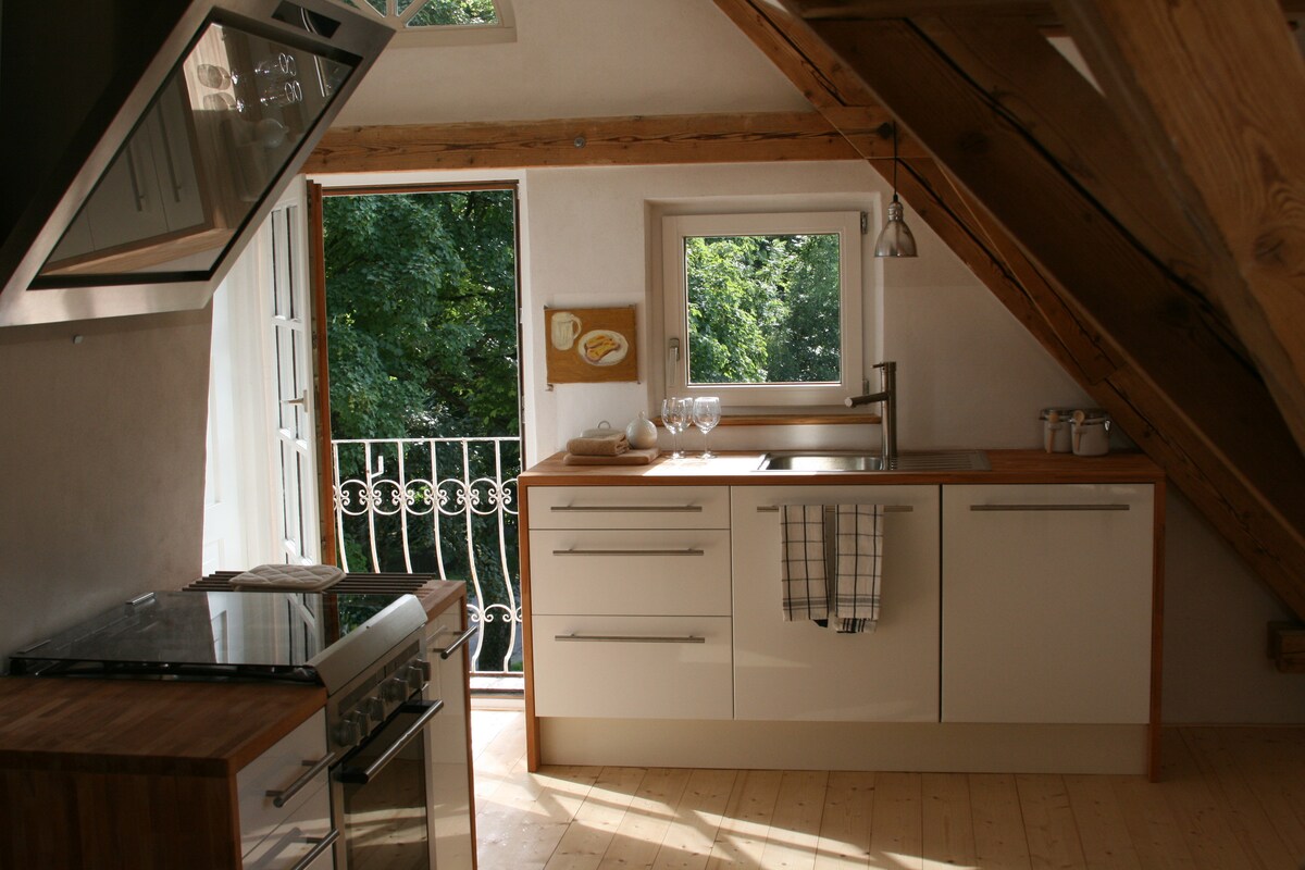 The cozy, light-flooded rooftop studio is set in a house built by an artist couple in Dießen am Ammersee, surrounded by a romantic garden with old trees and sculptures. From the outside, you can partially see the house's age. Inside, it has been lovingly biologically renovated in recent years with natural materials. The spacious loft in the attic consists of an approx. 60 sqm open space with a small balcony and modern bathroom.