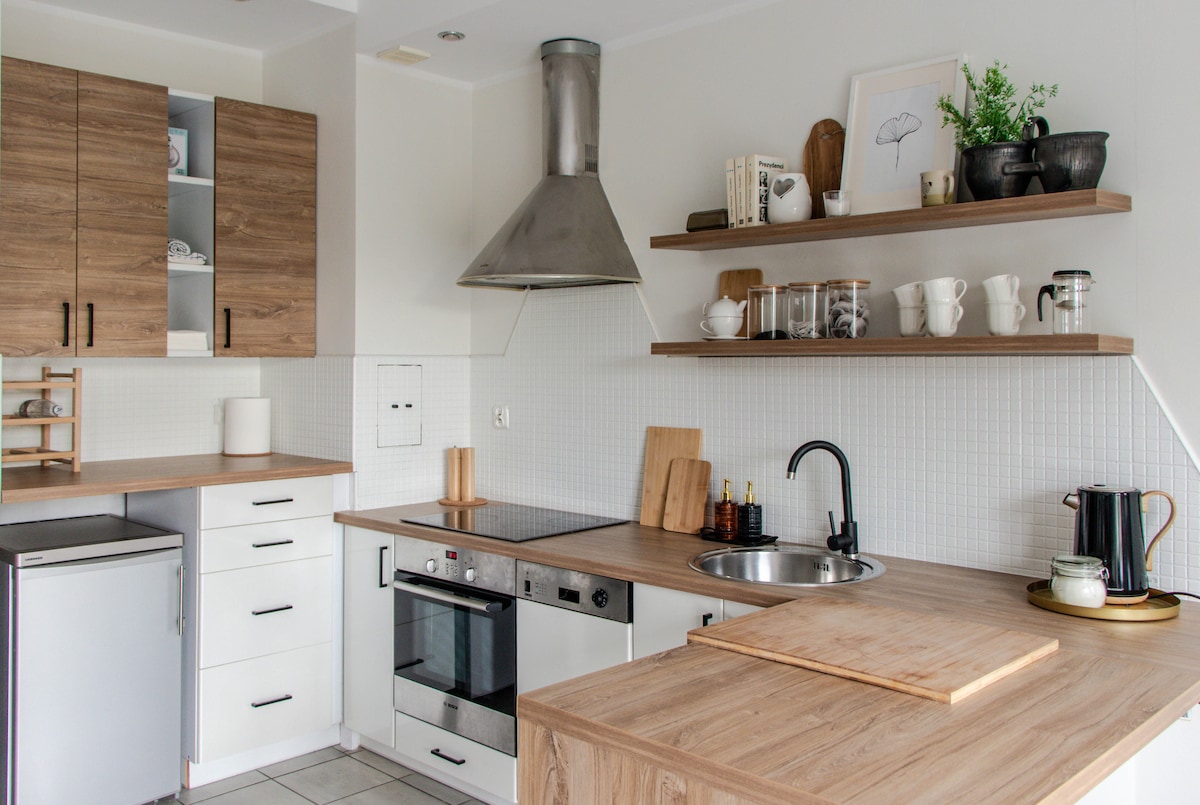 Comfortable, fully equipped apartment in a new building. A living room with an open kitchen divided into a dining and sitting area. The bedroom has a queen bed and a spacious closet. There's also a walk-in closet as an extra storage space. There are shops, restaurants and cafes in the area Equipment: air conditioning, coffee maker, kettle, iron, ironing board, washing machine Directions from Chopin Airport 20 min taxi 50 min communication from Modlin Airport 50 min taxi 120 min communication