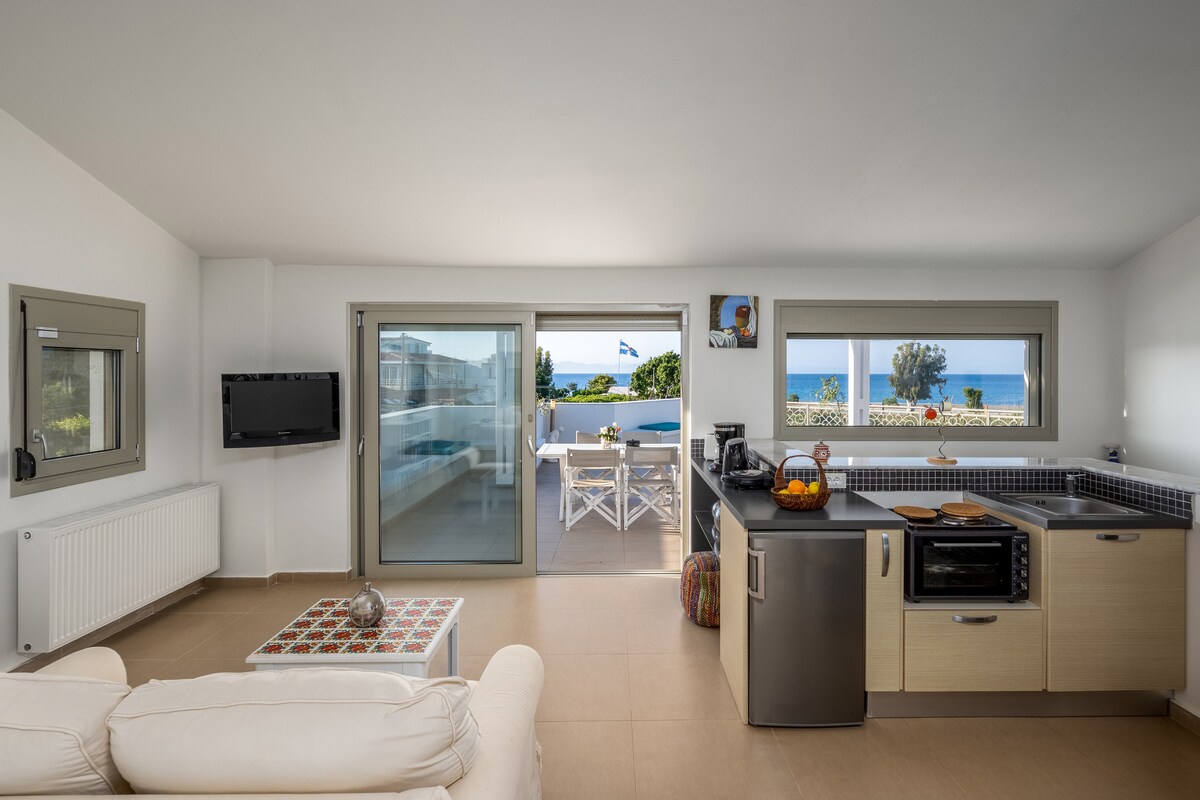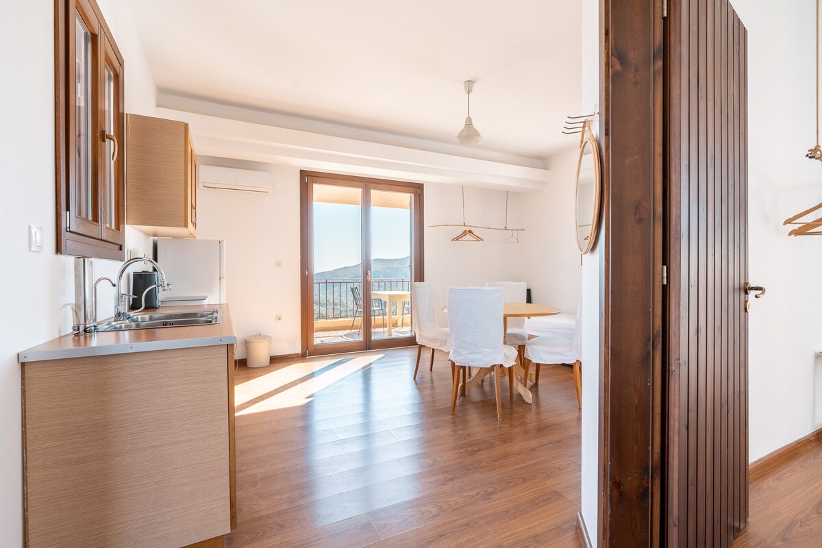 Cosy, stylish, comfortable and luxurious studio. My place is of excellent quality and fully equipped just 2 min from the beach. The large 70m2 veranda offers breathtaking views of the Aegean Sea. A large table with chairs and cushioned sofas are available in order to enjoy a meal or a drink while admiring the full sea view, romantic sunsets and sunrises. On the first floor of Villa Rodia accessible by 18 marble steps.