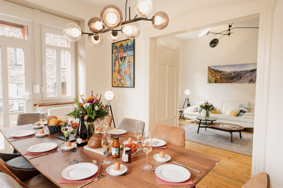 Welcome to your spacious 90 m² apartment in Cochem! With fantastic views from the large, covered balcony of the Moselle and the famous Reichsburg, up to six guests can enjoy their stay in two cozy bedrooms, two modern bathrooms and a large living-dining room. The fully equipped open kitchen, a large flat-screen TV, Wi-Fi, as well as a washing machine and dryer provide comfort like at home. Two private parking spaces at the house, as well as an elevator, make your stay easier.
