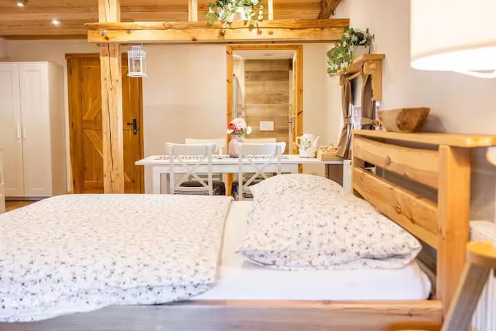 Our large apartment is located on the historic Mühlenhof Vodolenka – in the middle of nature, absolutely quiet and perfect for those seeking relaxation. On about 100 m² there is space for up to 5 people, with a fireplace, sauna and hot tub to relax. The highlight: deer right in front of the window, many lovely farm animals, a private fishing pond, barbecue in the garden and free rental bicycles. Ideal for families, nature fans and anyone who just wants to take a deep breath.
