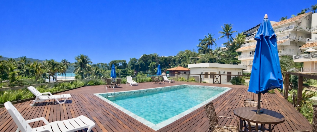 New/renovated apartment, with incredible sea views in the best location in Ubatuba. Close to everything and at the same time surrounded by nature. 1 bedroom with a double bed and ocean view Living room integrated with the kitchen Swimming pool in the condominium. Air-conditioned 200mb fast Wi-Fi Parking space 24-hour doorman It is located in Prainha do Matarazzo and 5 minutes from Perequê-Açu Beach. Modern and with a heavenly view. Because we are close to Café de La Musique, there may be noise on weekends.
