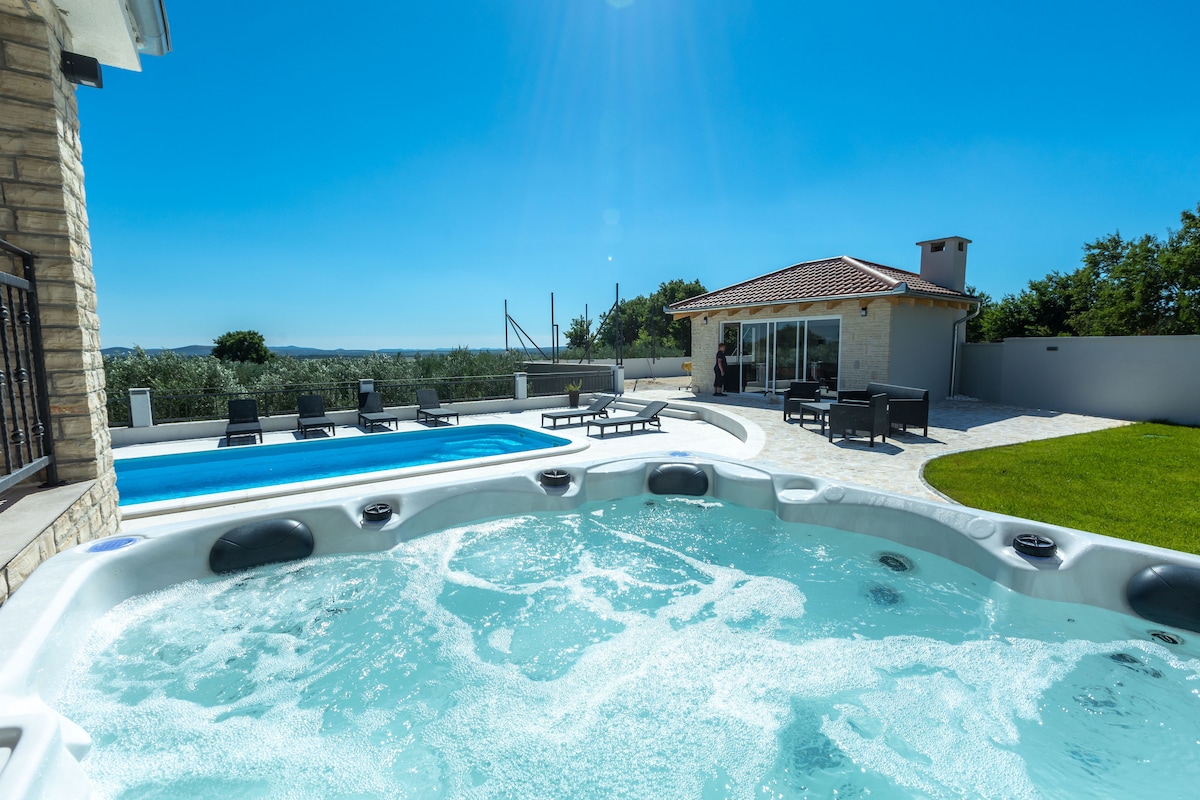 This beautiful villa with heated pool, hot tub and sauna is set on a remote and secluded landscape with a breath-taking view over the valley Heated pool from April to November Great place for relaxing and a starting point for exploring the region and Croatia! City distance Zadar is 28 km (airport 20 km) away Šibenik is 50 km away Split is 125 km (airport 99 km) away Attraction distance Plitvice lakes 125 km away Krka 45 km away Kornati 30 km away