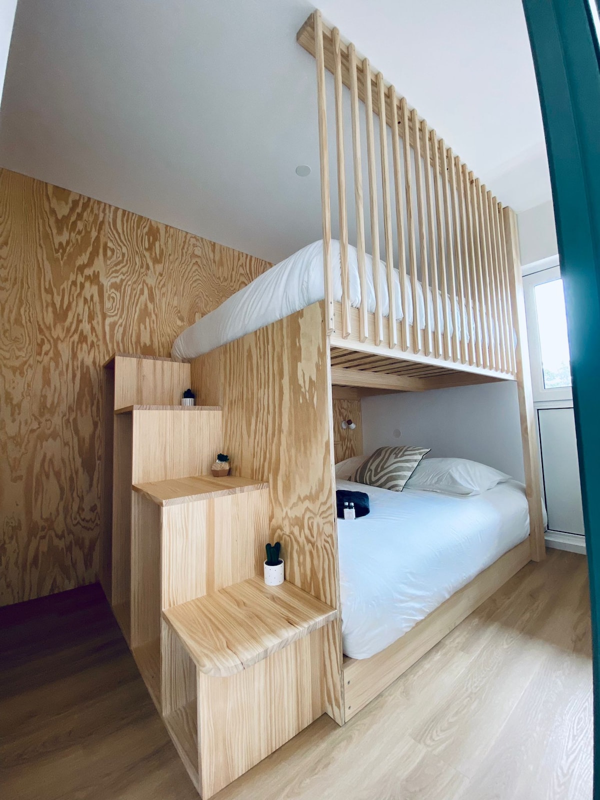 Seafront apartment for 4 people renovated in May 2024 with noble and tailor-made materials. Local craftsmen who are sensitive to the environment have put all their heart into restoring this apartment. There is a bedroom with two large 160cm bunk beds. All amenities within walking distance (restaurants, bakery, wine cellar, bus stops, etc.). The most beautiful beaches of Anglet are in front of you, you can enjoy the sunset with a view of the legendary Biarritz lighthouse!