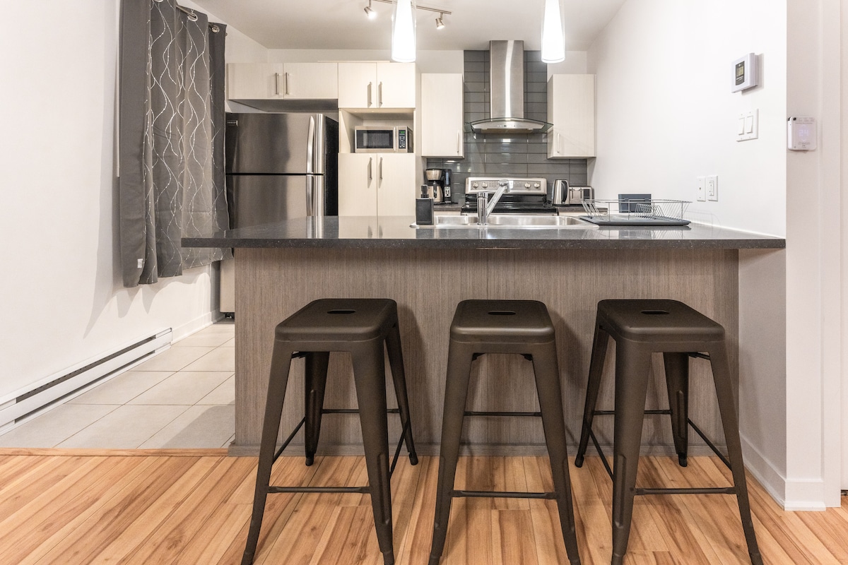 Modern Comfort near YUL Airport! This stylish retreat is just 15 minutes from YUL, offering a haven of modern comfort. You'll find everything you need for a relaxing stay, including a fully equipped kitchen to unwind in after a long day. Sit back, enjoy a complimentary cup of coffee or tea, and watch your favorite Netflix show. Book now and experience the perfect blend of convenience and style.
