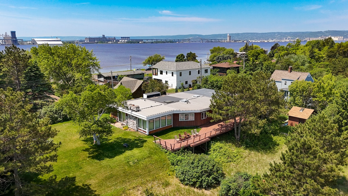 Secluded on 16 acres, with your own beachfront, enjoy the peace and relaxation of Kitchigami Lodge. Take in dramatic sunsets and soaring eagles, sitting upon the bluff mirador. Share stories by the firepit and play games in the sunroom. BBQ with family and friends and enjoy the bubbly swim spa. Duluth, two state parks and ski resorts are only 30 minutes away. Visit Bayfield & the Apostle islands on a day trip! Relax with friends and family and create memories that last a lifetime!