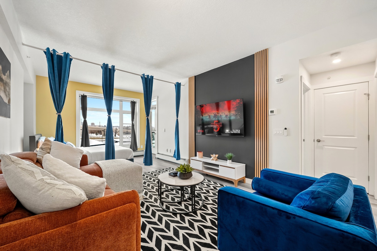 About this space This beautiful 1 bed and 1 den apartment is your home away from home. It offers all the convenience and comfort you need to make your trip memorable and comfortable Modern living space with floor to ceiling window that lets in plentiful and beautiful natural light, and offers amazing views of Downtown Calgary and Rocky Mountains in the distance Unbeatable location offers exceptional convenience to amenities and entertainment experiences. It's close to all public transportations.