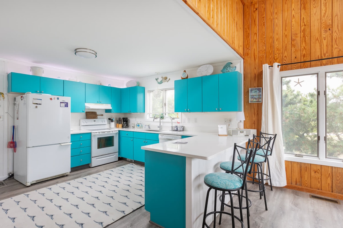 Updated Beach Cottage, short 5 min walk past 7 homes to the beautiful uncrowded beach. See reviews! Soundfront community pool 5/19-10/13 & tennis! Modern kitchen, baths, flooring, furnishings, appliances, decor. Comfortably sized bedrooms, open great room & dining. (1 K, 1 Q, 2 Twins). 2 TV's. Open decks, large screen porch, laundry, grill. Linens provided. Very quiet low density family neighborhood. Walk/bike to beach, Town of Duck for shopping, dining, soundfront boardwalk, & watersport fun.
