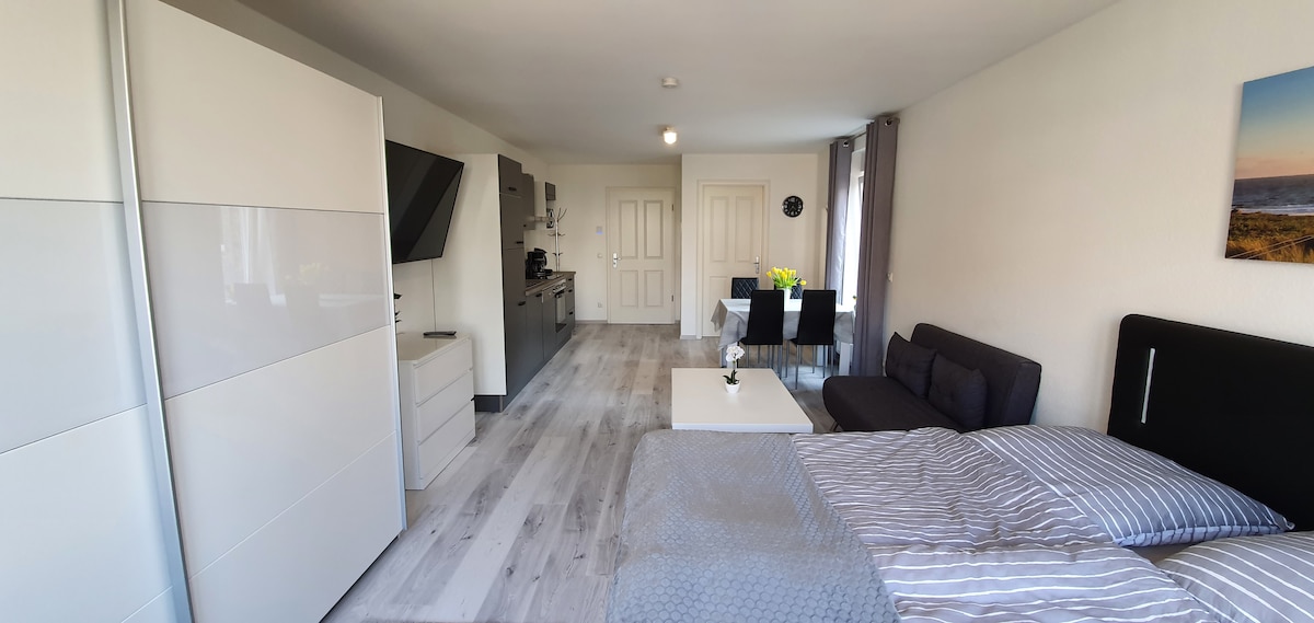 Welcome to our historic townhouse in the center of the city of Jülich. Our well-kept studio apartment offers all you need for a quiet, comfortable and unforgettable stay: → King-size box-spring bed for a good night's sleep → Large 55-inch smart TV with Netflix & satellite TV → Fully equipped kitchenette → Electric shutters → Free parking on premises
