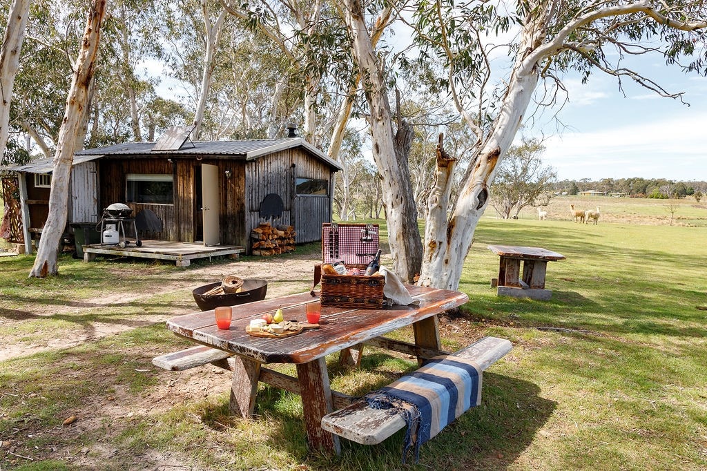 Enjoy an art, writing or yoga retreat, Work from home, or a wedding. Very private, sweeping rural views, 10 min walk to heritage cafes & galleries. Easy access. No steps. Pets welcome 🐶 fully fenced acre. French flax bed linen, heated bathroom floor, wood fire 🔥, yoga mats, merino socks, Wifi, a small library 📚 Queen & sofa bed. Fresh cafe bread, eggs, cheese, fruit & pantry provided, De Longhi espresso, Microwave, mini oven. Mona Farm 5min, Canberra 1h, South Coast 40min, ski fields 3h