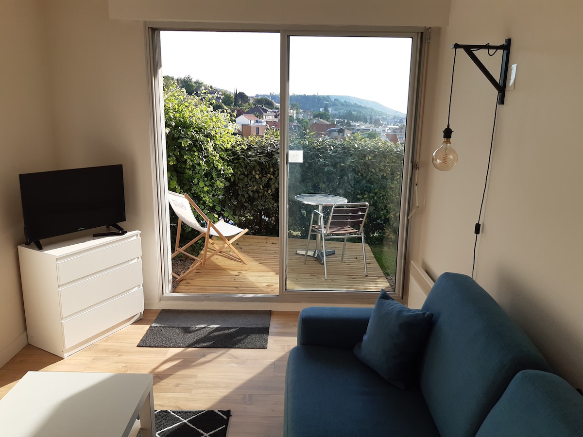 just 10' from downtown, you feel like in the countryside, in this large 70m² 1 bedroom appartement, entirely renewed in 2018, in a peaceful residential neighborhood, with an amazing view over Clermont-Ferrand and surroundings. A backyard with trampoline, grill and swimming pool are here for a perfect stay.