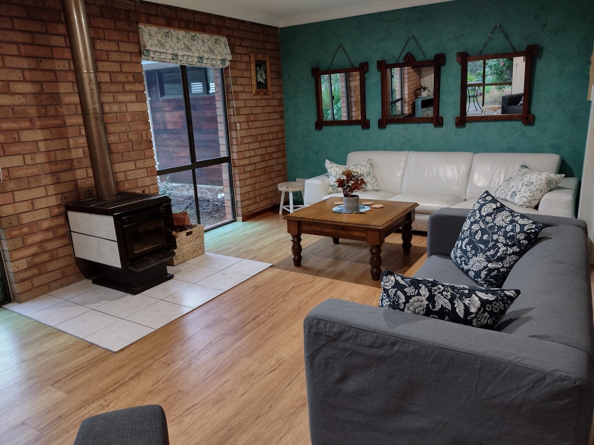 A spacious cottage located directly opposite the forest. It has a beautiful native garden with a relaxed country vibe. A short walk to town and many tracks to explore across the road. This is a great space to get away, relax and unwind. Enjoy the view from the front verandah or relax in front of the log fire.