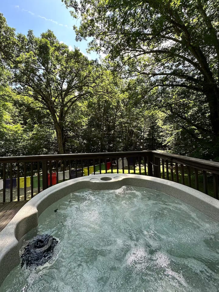Stay a short drive away from a national or state park and you’ll have plenty of things to do during the day. Pick a cabin that’s near some kid-friendly hikes and look for homes offering helpful rentals like kayaks, paddleboards, or a hot tub.
