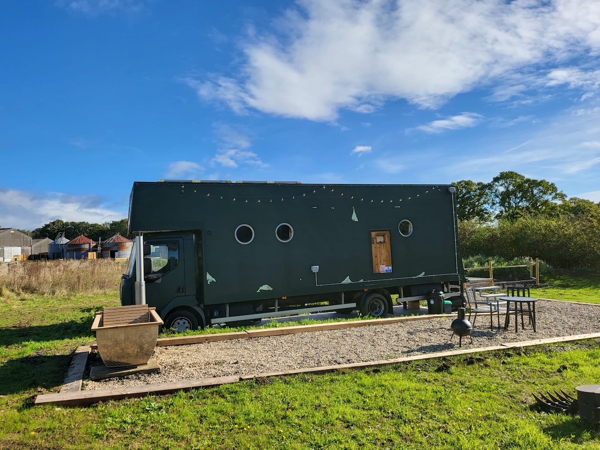 Standing in a field of a working, family run, farm is this beautifully converted lorry horse box. With a double bed over the lorry cab, bunk beds at the far end and a three seater sofa with a lovely view of the sunset out of the patio doors. The patio doors lead out onto a raised decking area where you can enjoy your coffee in the morning or a glass of wine or two in the evening, whilst star gazing. A stay in our horsebox is perfect for relaxing and getting away from it all.