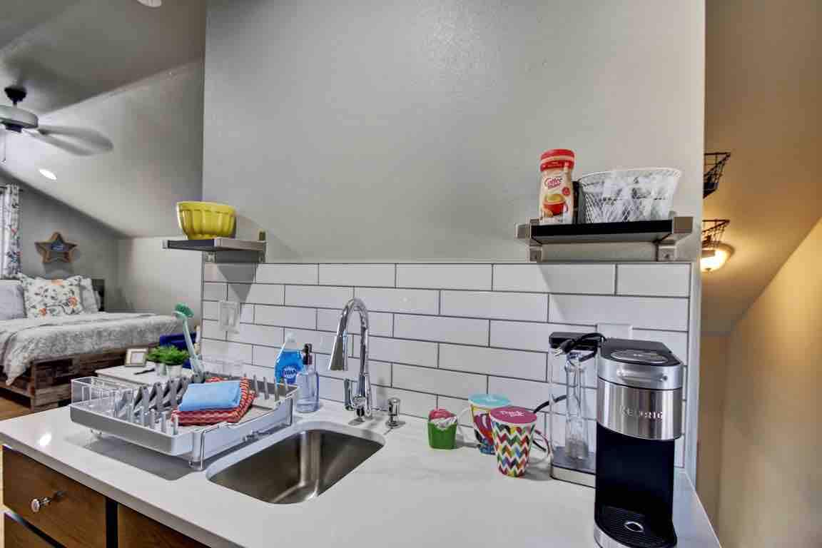 Bright and spacious Loft with open Living/Dining and Kitchen area. Large, comfy couches positioned in front of a warm and cozy gas fireplace and Smart TV. Prep a meal in the spacious kitchen with all new appliances and cabinets. All new dishes, cookware and utensils. Enjoy coffee on the patio from a Keurig. There are 2 Bedrooms with Queen size beds and an open Loft area at the top of the spiral staircase with a Queen bed as well. Great place to enjoy family and friends.