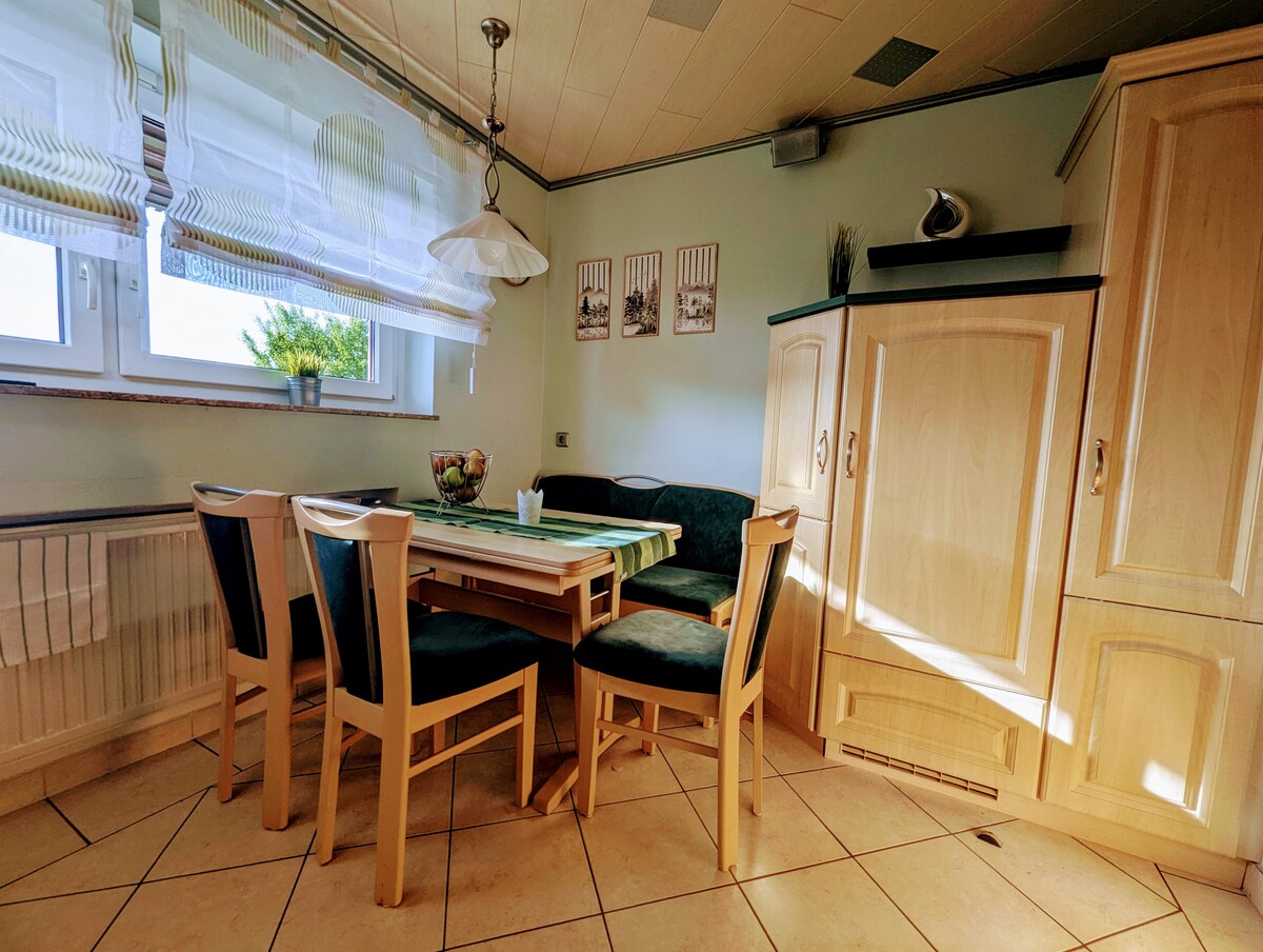 Welcome to our home! We rent a cozy and large sheep/living room with kitchen and bathroom on the second floor of the house. The apartment is located in Fulda - Kohlhaus. Parking is available free of charge on the street. By car, you'll be in the city center in about 10 minutes, but you can also take the bus. The stop is about 8 minutes' walk from the apartment. Shopping is good in the Kaiserwiesen shopping center. About 18 minutes on foot.