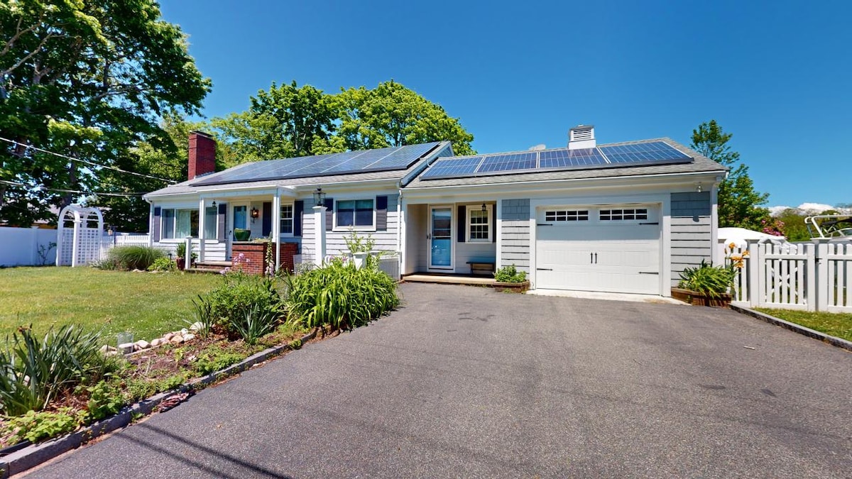 Entire home, 3-night minimum. Dining/living area, modern kitchen (gas), deck, garden. Master BR (queen bed), adjoining bedroom (full bed), master bath (tub & shower). Upstairs BR (king bed, day bed, trundle), shower, large flat TV. Basement entertainment area full sofa bed, large flat TV, table for art, games, projects. Books & art indoors, nature outdoors, birdsong in season. Walk to Woods Hole, WHOI, MBL, bike path and beaches. Outdoor shower. Nobska Beach pass available at beach for $40.