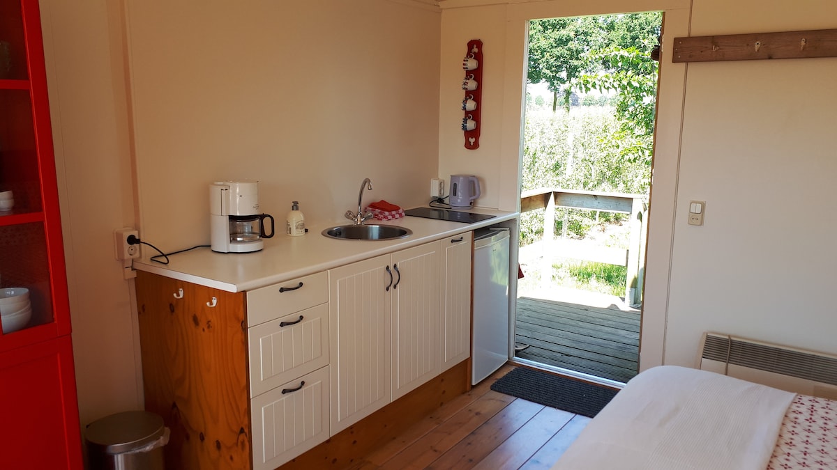 Nice, secluded orchard cottage overlooking the apple and pear orchard in the fruit garden of the Netherlands: the Betuwe. Studio with two beds. Kitchenette with fridge, 2-burner induction cooktop, coffee maker and kettle. Separate bathroom sink, shower and toilet. A stone's throw from the Waal and its floodplains, in the middle of the city triangle Arnhem, Nijmegen and Tiel. 5 minutes from the A15. Baby bed and high chair available.