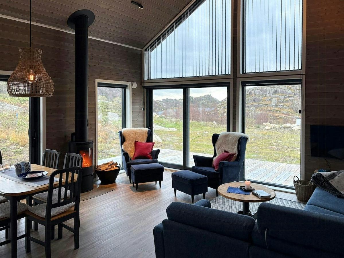 Our newly built modern cottage near the fishing port of Sirevåg is located between white sandy beaches and cliffs. The cottage in a stylish design has 6 sleeping places, two bedrooms and a spacious sleeping loft. The panoramic windows offer a great view with a sense of space and openness. The cottage is located in a newly built cottage area. There are hiking, biking trails, golf rounds and beach life. By car you reach Norway's famous landmark - Pulpit Rock, the charming wooden town of Egersund and Stavanger.