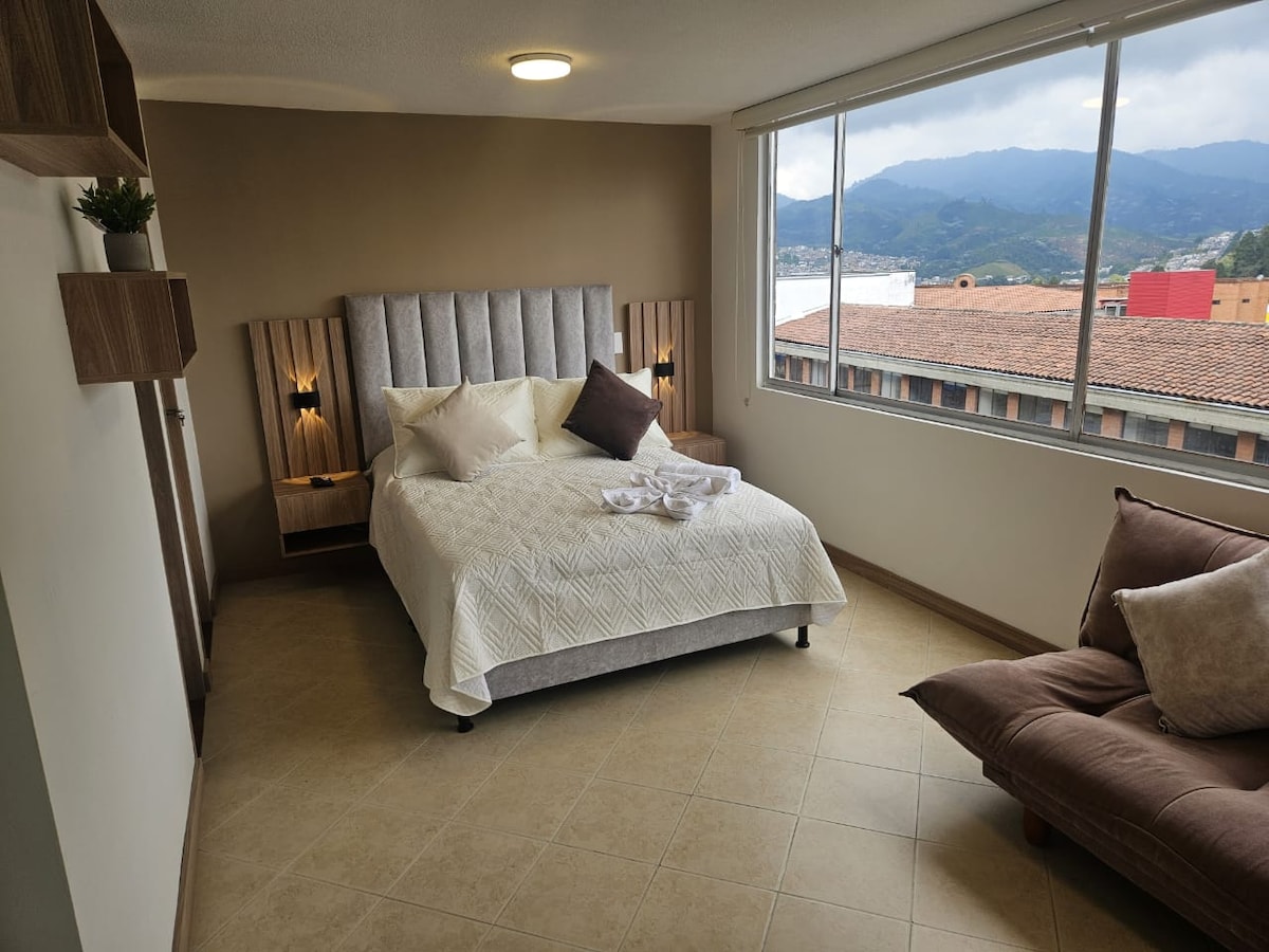 Un hospedaje con la receta perfecta: la comodidad de un alojamiento nuevo y moderno,la belleza del eje cafetero,el aire limpio,la noche estrellada,esta es una experiencia llena de tranquilidad que le recargara de energía mientras disfrutas del jacuzzi con una copa de vino y las luces de la cuidad a sus pies .Todo dentro de un marco de privacidad y excelente atención.