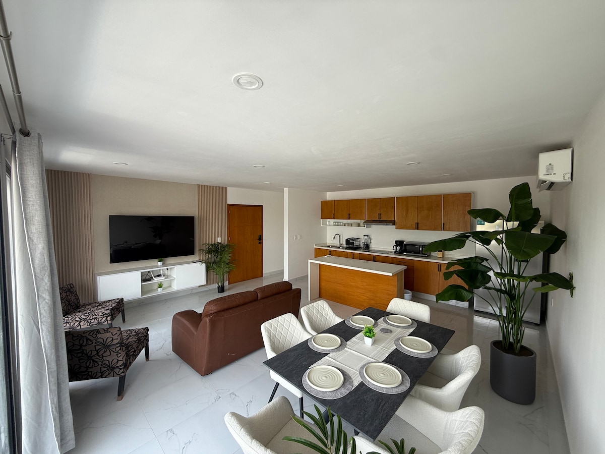Enjoy a relaxing experience in our elegant and cozy oceanfront apartment; ideal for those looking to relax as our space offers comfort and serenity with a beautiful view. The interior design is intended to provide a sophisticated atmosphere, while every detail ensures that you feel at home. Perfect for couples, families, or travelers looking for a quiet space with all the modern amenities.