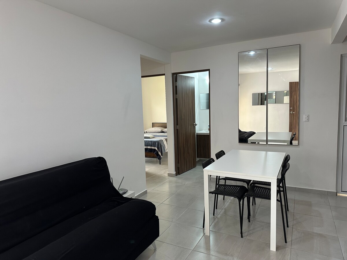 Modern new apartment with 2 bedrooms, 1 full bathroom, wifi, S-Mart TV and free parking. Ideal for work or leisure trips. Located in a safe and quiet area of Querétaro, with easy access to main roads and areas of the city. 24-hour security and a great location in one place! 5 min from Zibata, Zakia, Anahuac 18 minutes from the historic center 20 min to Airport