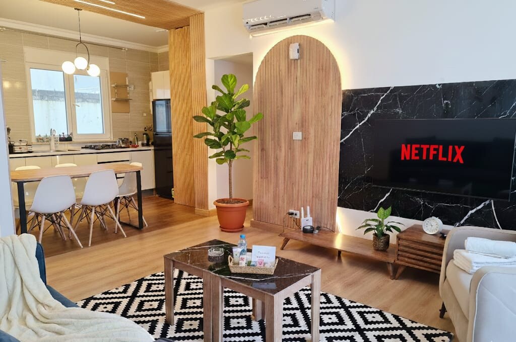 Enjoy the peaceful 2 bedrooms boho style apartment at one of the best compounds in Egypt Madinaty With many shopping malls, coffe shops, central park,we are La Maison innovation co. We know how to make your hotel stay experience with more privacy, enjoy madinaty green landscapes from our terrace, smart tv, free wifi, fully equipped kitchen, we offer van for tours and airport pickups, we guarantee you will have a unique stay at our listing..we care about our guests,treat them like family