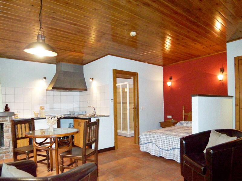 The barn has a living room with a black kitchen, a bedroom with a double bed, a loft with two beds, and a sofa bed in the living room. It also has a double shower with a window to admire nature while showering. Fireplace, swimming pool, and river. And an environment with a monumental complex formed by a Romanesque church with a crypt, a modernist cemetery and an Iberian village 5 minutes away. Spectacular! 5 minutes from a rural restaurant and 10 minutes from the town/city.