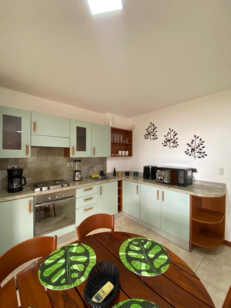 Wake up to the Caribbean: Panoramic views from your King bed and the shower. Luxurious open-plan apartment for 4 guests (King bed + sofa bed). The complex features a pool, playground, and direct access to a tranquil beach. Fully equipped with a gourmet kitchen and fiber optic Wi-Fi. Zero stress: Ask about our Moto Scooter package to move around the island. Your premium retreat awaits!