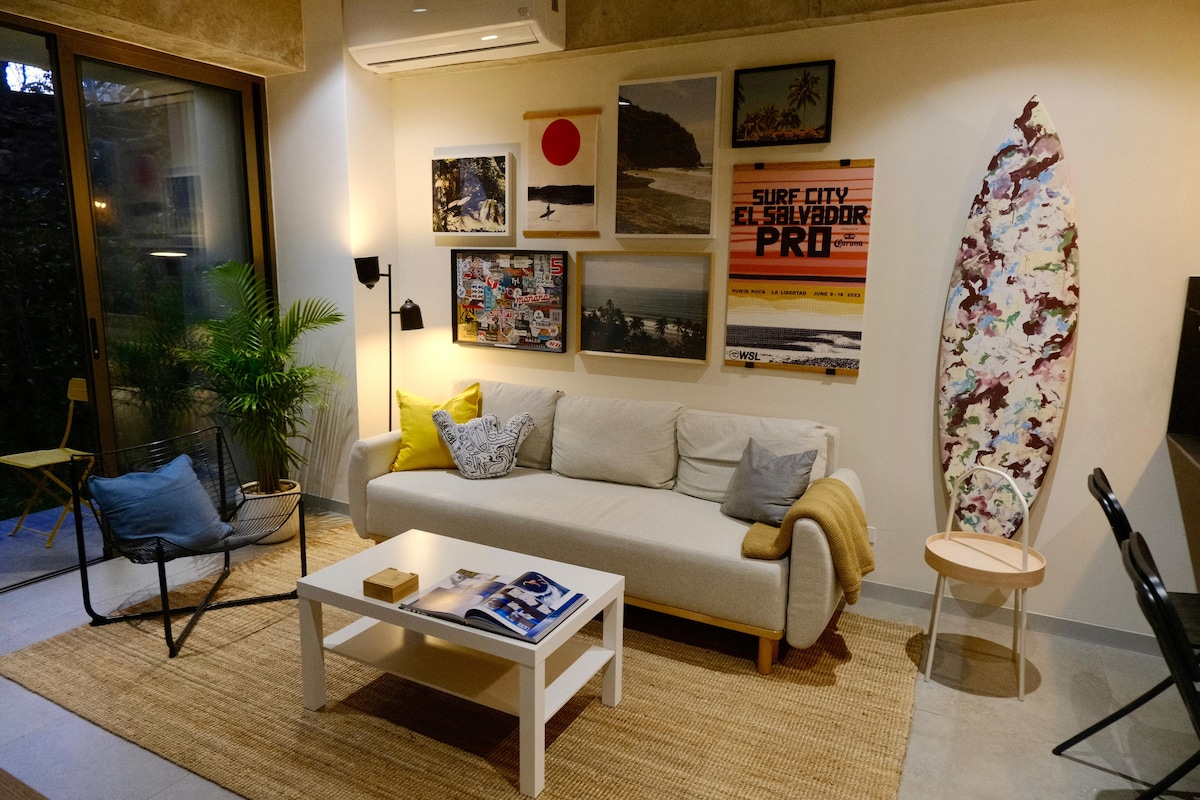 ✨ Tu escape perfecto en Surf City / Your perfect getaway in Surf City ✨ A solo 4 minutos de El Tunco, en el corazón del Sunzal, disfruta de un refugio tranquilo cerca de las mejores playas para surfear del mundo. Nuestro loft ofrece todo lo que necesitas para una estadía inolvidable: 🏡 Cocina completa 🚿 Baño privado 🍽️ Espacio para comer 🛏️ Cama cómoda con vista al mar. Wifi rápido Piscina 🏊 compartida. Ideal para escapadas cortas o largas, en un ambiente seguro y relajante 🌊