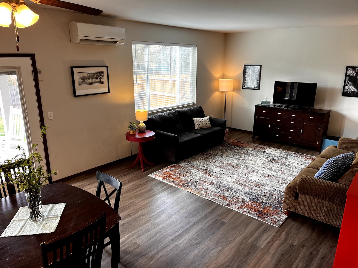 Have a relaxing getaway in our cozy, private one-bedroom suite! Minutes from downtown and walking distance from the university. Self-check-in with a door lock keypad for your convenience. There is a mini fridge freezer, kitchenette, microwave, smart TV, electric fireplace, desk, shower, and more! Enjoy the art of Ellensburg by a local artist. You may be serenaded occasionally during the hours of 9 am to 6 pm on weekdays by quiet violin and piano lessons and hear our young family during the day