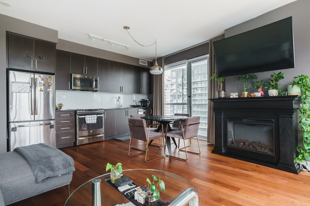 Entire stylish and modern condo in the heart of DT Toronto! WALK to Toronto's main attractions: → CN Tower / Aquarium / Rogers Centre (7 mins) → Scotiabank Arena (2 mins) → Union Station (2 mins) → Lake Ontario Waterfront (3 mins) → Direct access to the underground PATH Highlights: → Secured building access with 24/7 concierge → Spacious balcony with patio set → Electrical fireplace → Washer + dryer with detergent →MONTHLY STAYS: Access to fitness centre, pool, sauna!
