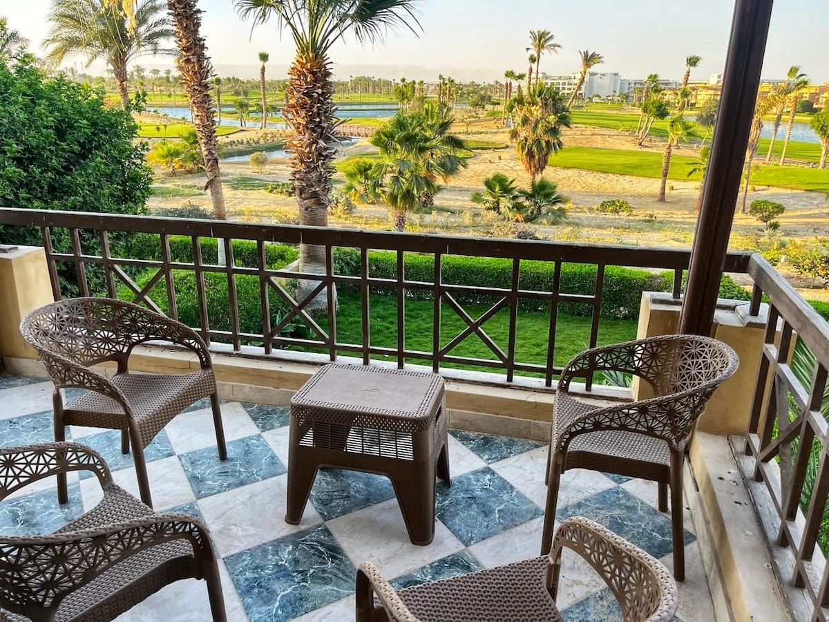 A private tranquil 1 Bedroom ground floor chalet with a private terrace and a garden in front. at Stella di mare Sea view Resort, For Families and groups. We offer private Hire Airport pickup & transport from & to chalet + from Cairo to Chalet & vice versa. Prices will available upon inquiry.