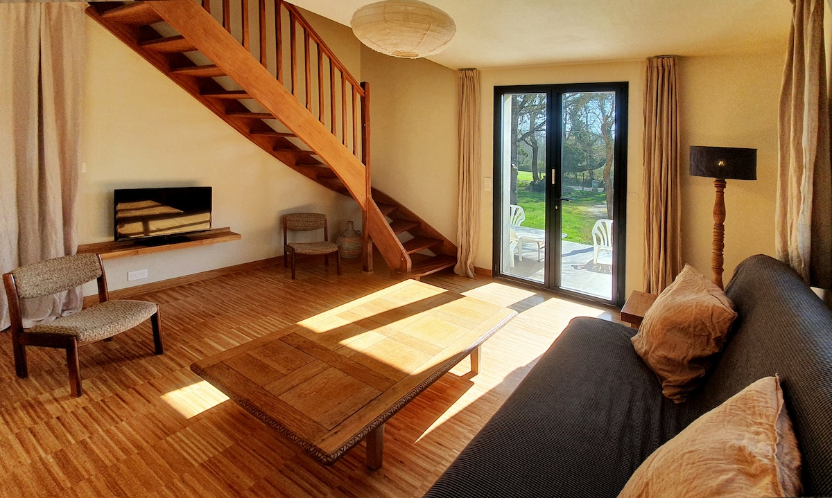 Hâvre de paix tout confort classé 4* pr 2 adultes (accueil d'une 3ème personne possible +15€/nuit après 2 ans) dans une charmante longère d'un hameau en impasse, ce gîte est un duplex de 45m2 CLIMATISE attenant à la maison d'habitation. Entrée directe sur cuisine très équipée & mini-salon, TV. A l'étage, grande chambre lumineuse de 25m2, lit & canapé, SDE douche confort, wc séparé. Wifi bureau & TV. Linge lit & toilette fourni. Parking extérieur à disposition. Location à la journée, réunion pro.