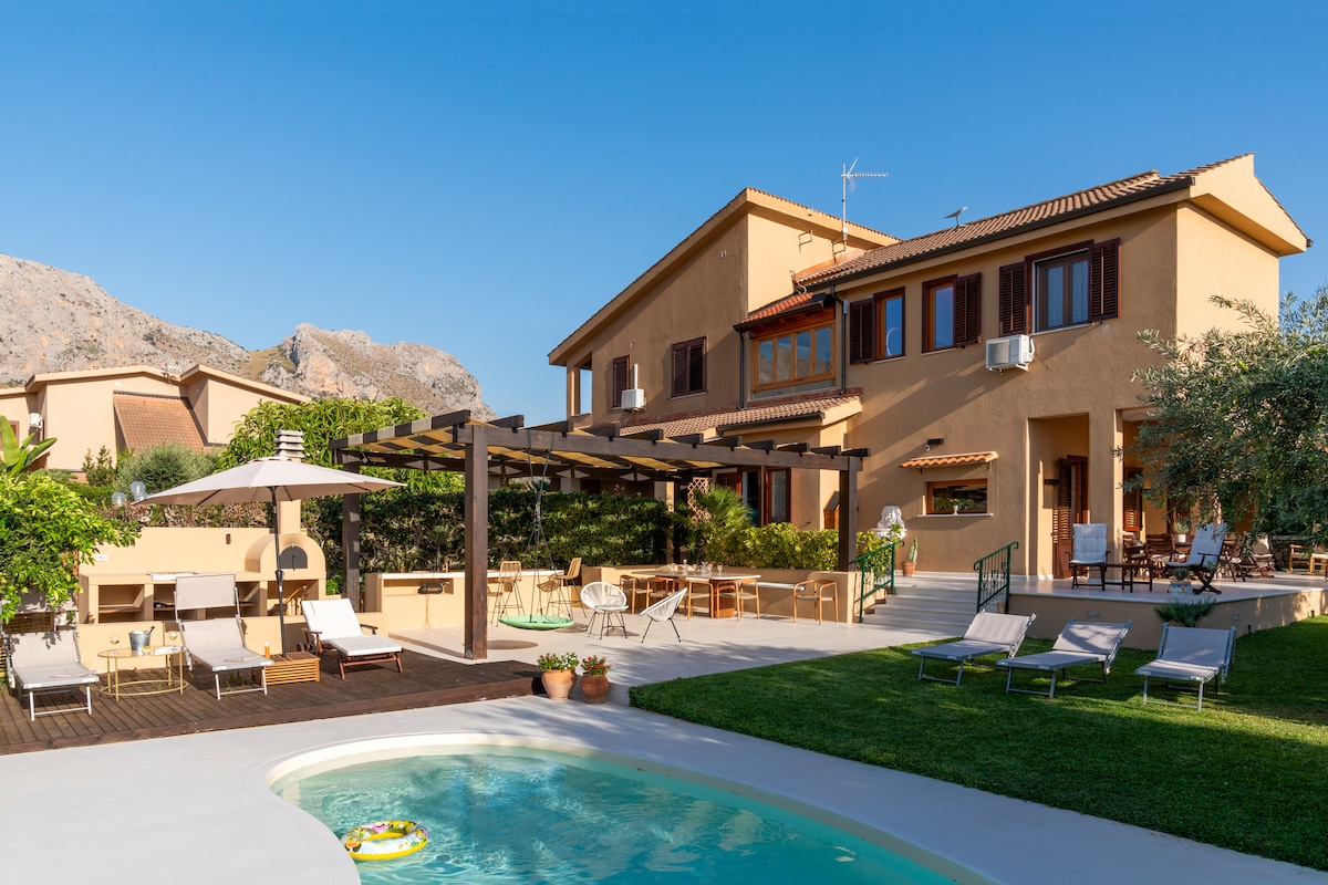Be enchanted by this elegant villa near Palermo, perfect for families or friends. Fully renovated, it offers year-round comfort with large indoor and outdoor spaces. It hosts up to 6 guests in 3 bedrooms and 3 bathrooms, with a private indoor jacuzzi overlooking the Gulf of Terrasini. Outside, enjoy a pool, a play area for kids, and an outdoor kitchen with a built-in oven—perfect for unforgettable summer evenings.