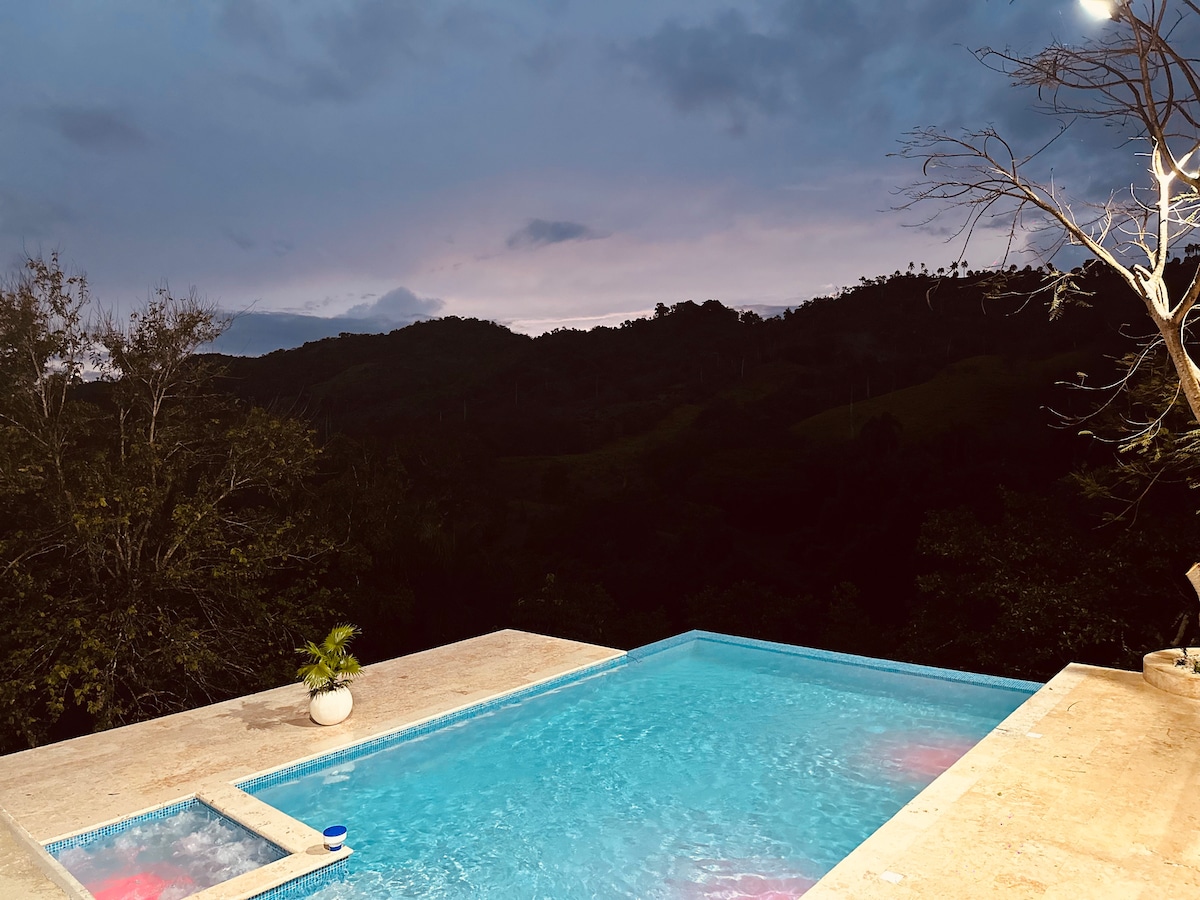 Relax & immerse yourself in nature with stunning valley views from 2,600 feet, where sunsets paint the sky and nightfall offers a tranquil landscape. Enjoy the perfect mountain climate and a cool breeze, with the city emerging through the morning fog as you sip your coffee. Whether disconnecting, or working remotely, our high-speed Starlink keeps you connected, with serene, inspiring views Cola De Pato River tours 3min STI airport 39min Santiago 50min Cabarete 45min Sousa beach 1:15 min