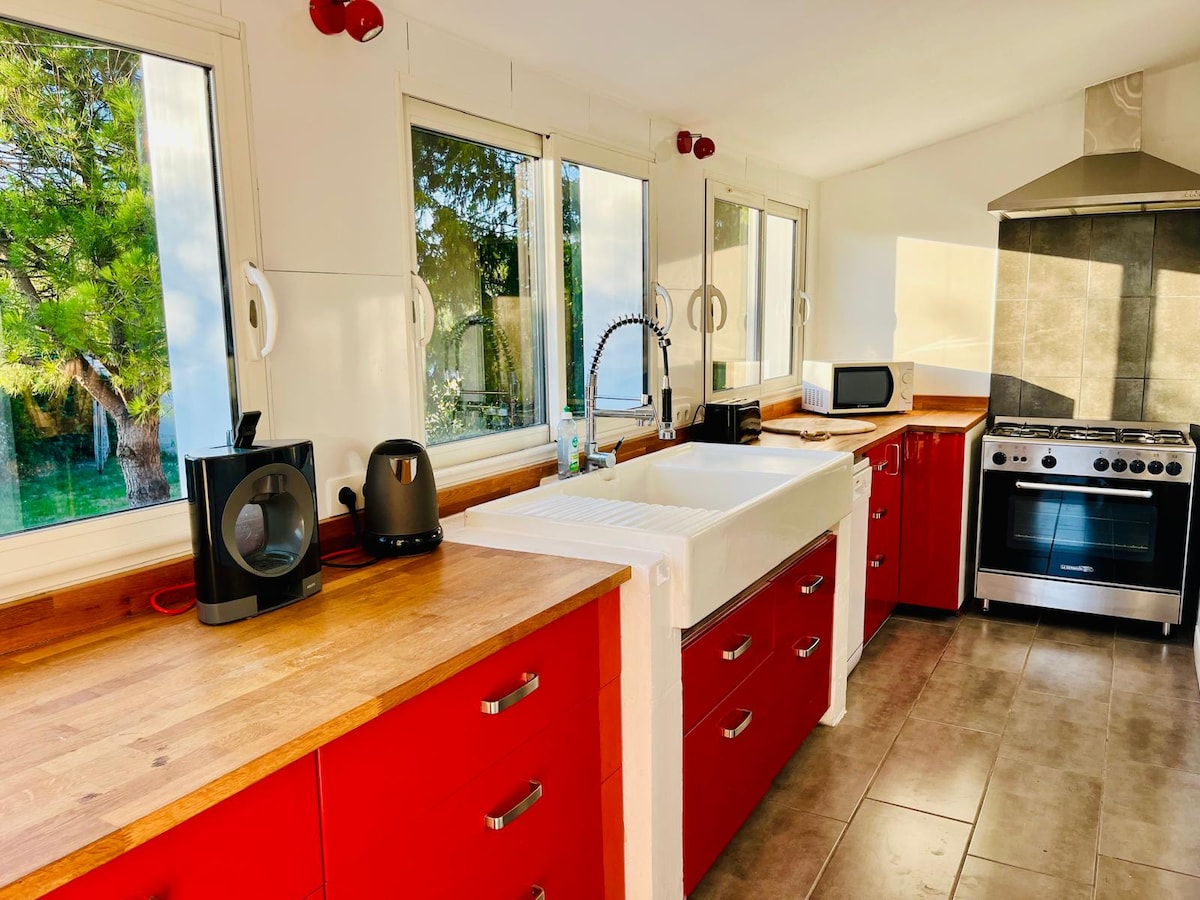Quiet, this charming 150 m² family villa offers you a beautiful 75 m² air-conditioned living space. It has 4 bedrooms with individual air conditioning, one of which is extra and another with toilet and sink (cold water). The spacious bathroom consists of a shower with double sinks and a bathtub. A south-facing terrace with 2 garden tables and a barbecue will welcome you on a 1500 m² plot. The 10x4 pool is available and heated from May to September.
