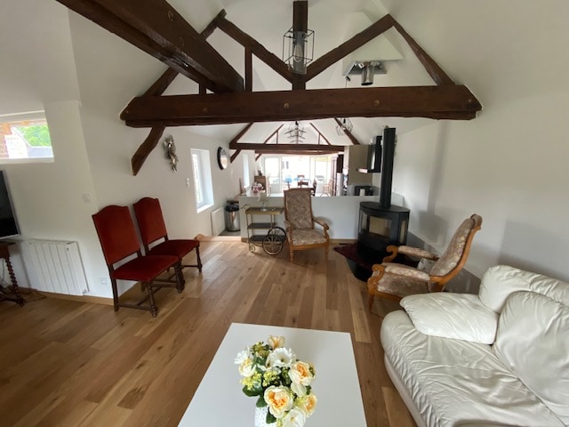 1.5 hours from Paris, in the Normandy countryside, this presbytery renovated in 2023 on 1700 m2 enclosed by walls, will welcome you with family or friends. The exteriors offer you a beautiful pool under shelter, heated from April to October, two terraces and a petanque court. You will have access to a gym and games room including, bike, treadmill, foosball, shuffleboard and billiards etc. In July and August, bookings are made for full weeks from Saturday to Saturday,
