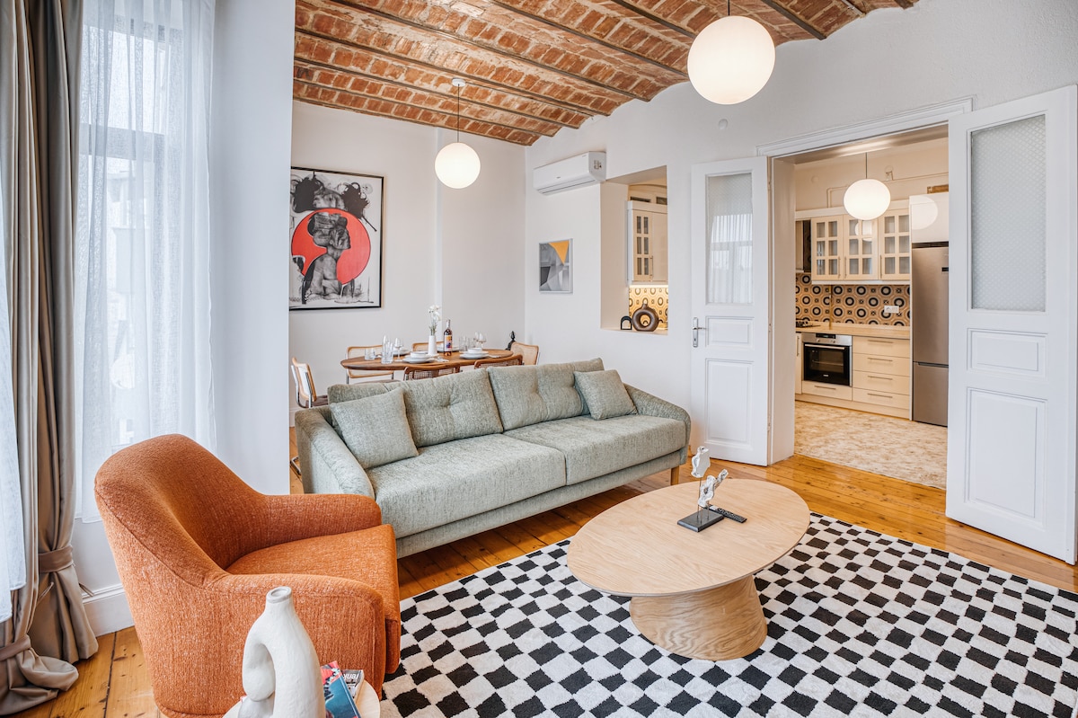 Stylish flat in Balat with panoramic Golden Horn/Galata Tower views. The bright living room features floor-to-ceiling windows, a smart TV, and authentic hand-woven rugs with vibrant Turkic pillow cases that bring cultural elegance. A fully equipped kitchen with modern appliances makes cooking easy, while the cozy bedroom offers a work desk for longer stays. Just steps from Balat’s historic streets, colorful cafés, and art galleries, this home blends comfort, design, and heritage.
