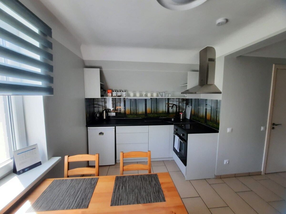 Studio apartment - everything at hand, convenient to use equipped kitchen part, there is a living room part with TV. Wi-fi is available, the code is on the back of the decoder. There is a sofa to comfortably watch TV, a double bed for a good night's sleep, road dust can be washed off in a suitable room with a shower. ...a quiet place on the city border. Close to a sports hall, shop and hospital.