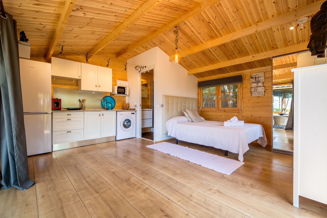 Cabaña de madera maciza de 25 m2 con porche exterior de 30m2 en una colina a 50 m. sobre el nivel del mar. Cuenta con todas las comodidades, pero lo más importante son sus impresionantes vistas a la playa de Valdevaqueros ( la playa está a 900 metros) y a la gran duna. Cuenta con jardín con césped y hamacas, ducha exterior,minipiscina de 4 m de largo por 2,40 de ancho (todo ello privado) y dispone de plaza de parking privada Disponemos de una plancha eléctrica para cocinar en el exterior