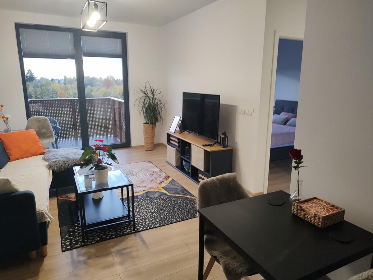 A modern, cozy and fully equipped 46 sqm apartment located in a guarded, quiet housing estate, with its own parking space in the underground garage. Bright bedroom with double bed, kitchen equipped with dishwasher, oven, microwave, toaster and coffee maker. Fresh coffee, drunk in a spacious garden is just one of the many things that will make your stay more pleasant. Fast Wi-Fi, cable TV, or a home theater will provide you with entertainment after a relaxing bath.
