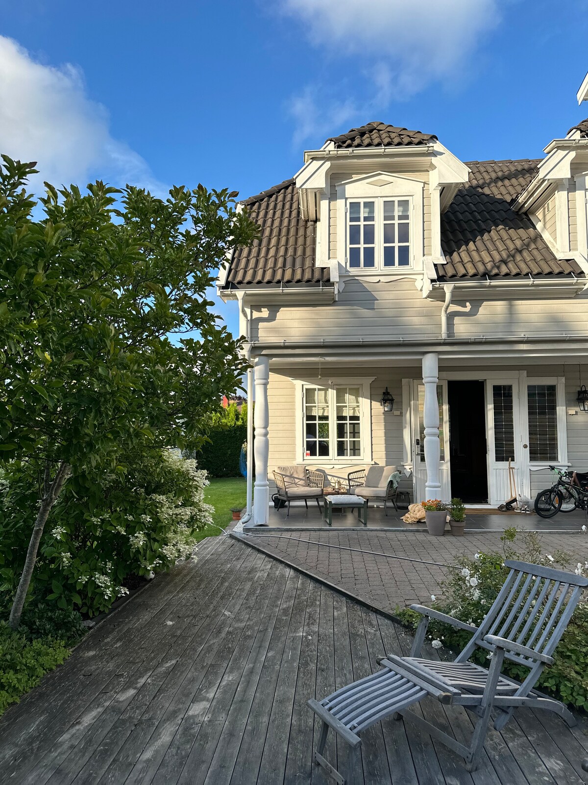Velholdt hus i fredelig nabolag med god atmosfære og i umiddelbar nærhet til både sentrum, sjøen og skogen, strender, golfbaner og turstier. Kun 10 minutters gange til brygga og sentrum. 3 soverom og en stor terrasse rundt huset med gassgrill, og hagemøbler. I stuen er det 75» TV med flere strømmetjenester og de fleste kanaler, stor sofa og peis. På soverommene sover dere i komfortable dobbeltsenger i god kvalitet. Nytt kjøkken med alt nødvendig utstyr.