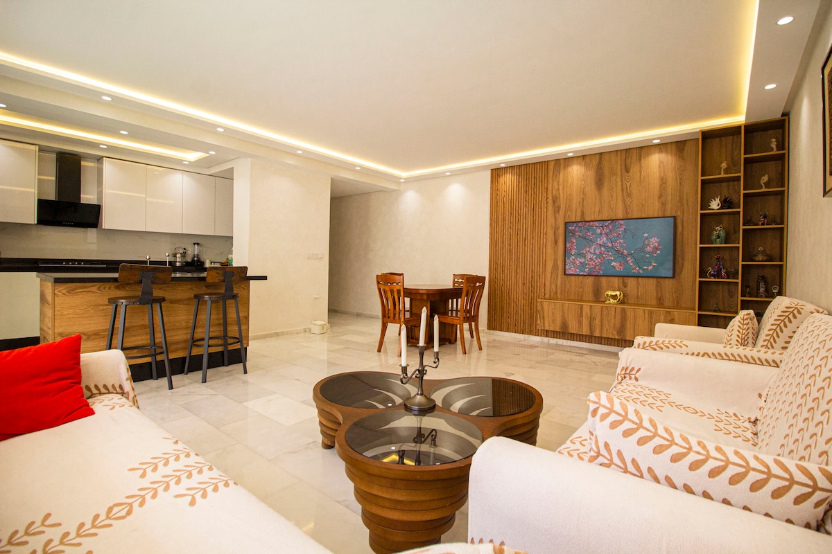 **Merci de lire la description jusqu’à la fin** Découvrez notre charmant appartement à Tanger, idéalement situé dans un complexe fermé et sécurisé, à deux pas du Movenpick, du Casino de Tanger, ainsi que des cafés et restaurants. Profitez d’une magnifique terrasse spacieuse avec vue imprenable sur la baie de Tanger, parfaite pour un café le matin ou un apéritif au coucher du soleil. Idéal pour couples et familles en quête d’une escapade inoubliable.