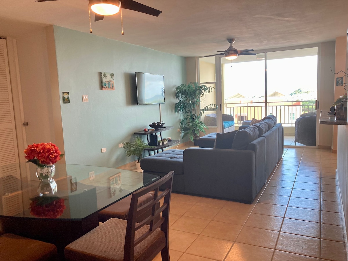 Modern 2nd floor condo in an older condo complex offers a fully equipped kitchen, LR/DR, 3BR/2BA w/2 queen beds & 1 king master suite. A private 1250SF terrace wraps around the condo allowing for a spectacular 270* view over the sea, the national ecological preserve and El Yunque rain forest. The secured complex offers parking, a small gym and direct access to the beach. This beach can have strong currents but a calm beach is a 5 min walk away. Stop for a piña colada on the way or a bite to eat!