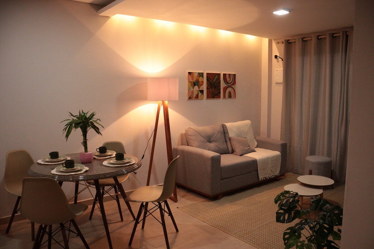 Spacious, comfortable and well-equipped ground-floor apartment. It has a suite with a closet, a second airy bedroom, a large living room with a TV, a dining table for 6 people, a full kitchen with new appliances, as well as a gourmet area with a covered barbecue and laundry. Ideal for couples, families or business trips. Quiet location, easy access, safe entry with password and all the items for a practical and cozy stay.